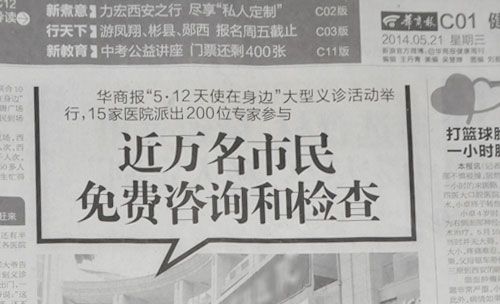 【5·12天使在身边】后续报道,5月18日,由华商报社主办的“惠民健康”大雁塔汉唐广场大型义诊活动火热举行,、省医院、西安中大耳鼻喉医院等15家医院200多位医生参与,给近万名市民提供帮助。据不完全统计,西安中大耳鼻喉医院接诊近1000人,免费为市民做详细的耳、鼻、咽喉检查,发放爱耳体检卡等。医生们表示,虽然累,但能够为市民提供实际的帮助,作为医生很值得。