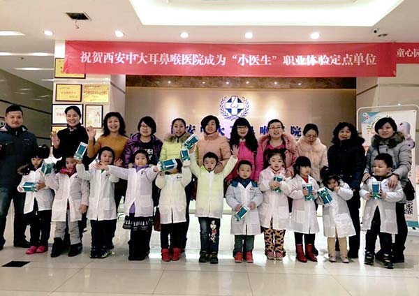 2015年12月5日,西安中大耳鼻喉医院举办了首次“小医生”职业体验活动,学生家长满意而归,社会反响十分热烈;2015年12月26日,顺应群众意见,西安中大耳鼻喉医院与童心园亲子体验营再次合作,举办了场更加精彩更有意义的耳鼻喉小医生体验活动;2016年1月16日,跨过一个新年,在大家的翘首以待下,“小医生”亲子体验轮活动终于再次开课啦。
