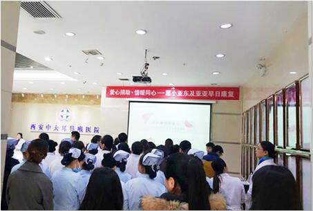 2016年2月16日,为小亚东献爱心的捐助活动如约举行。西安中大耳鼻喉医院医务人员全部到场,为此时仍在病床上,等待后续手术治疗的小亚东献出自己 的一份心意。据统计,150名员工合计捐赠善款近3000元。希望能以此绵薄之力帮助其家庭早日走出困境,期盼小亚东手术成功,早日出院。小亚东的父亲、叔父、姐姐现场接受善款赠与并表达了感谢。